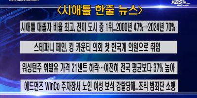 속보 No items. KBS-WATV 라이브 스트리밍 워싱턴주 / 오리건주 로컬뉴스 시애틀 한인회관에 ‘전기차 충전소’ 생긴다… PSE 12만 불 그랜트 December 12, 2025 광역시애틀한인회(회장 김원준, 이사장 나은숙)가 한인 커뮤니티의 친환경… 13일 시애틀 ‘자유민주·한미동맹 포럼’ 강연회 December 12, 2025 시애틀 지역의 여러 한인 보수단체와 지도자 등 30여 명으로 구성된 시애틀… “12월 13일 강연회 취소하라”…시애틀 진보단체 성명 발표 December 11, 2025 시애틀 지역 한인 시민단체들이 오는 12월 13일 예정된 강연회에 대해 즉각 중단을… 오레곤한인회, 오리건메트로와 첫만남 상견례가졌다 December 08, 2025 오레곤한인회(회장 프란체스카 김, 이사장 김헌수)가 지난 4일 오레곤한인회관에서… “이젠 묘지 청동 명판까지 훔쳐가”..워싱턴주 섬너 참전용사 명판·청동 표지 사라져 December 08, 2025 워싱턴주 섬너 묘지에서 최근 금속 도둑들이 명판과 청동 표지를 훔쳐갔다고… 한인 14세 첼리스트 앤서니, 올림피아 심포니와 하이든 전악장 협연한다 December 08, 2025 워싱턴주에서 활동 중인 한인 천재 첼리스트 앤서니 김(Anthony Kim, 14세, 한국명… 시애틀 1인 가구 사상 최대…성인 4명 중 1명 혼자 산다 December 08, 2025 시애틀에서 혼자 사는 사람들이 사상 최대 수준에 달했다. 주거비가 미국에서… [부고] 오범세 서북미 충청향우회 회장 별세 December 08, 2025 오범세 서북미 충청향우회 회장이 지난 5일 저녁 심장마비로 별세했다. 향년… 대한부인회,55년 역사 담은 다큐멘터리 제작…2027년 공개한다 December 08, 2025 대한부인회(이사장 박명래)가 2027년 대한부인회 창립 55주년을 앞두고, 지난… 팩토리아몰에 한국 브랜드 35개 모인다 December 08, 2025 시애틀 지역 최대 한국형 크리스마스 마켓이 벨뷰 팩토리아몰에서 열린다.… 동영상 뉴스 KBS-WATV 시애틀지역(서북미) 한줄뉴스/서북미주간날씨/뉴스게시판(20251201) 페더럴웨이 통합한국학교, ‘김치의 날’ KBS-WATV 시애틀지역(서북미) 한줄뉴스/서북미주간날씨/뉴스게시판(20251124) “230표 차 아쉽지만 의미 있는 오레곤한인회, ”추수감사절 맞아 사랑의 온정 시애틀총영사관, 재외동포 안전을 위한 도상훈련 서은지 시애틀총영사, ”워싱턴대학(UW)서 한미 142년 5MinBiz 5MinBiz (Episode 29) 행정위반 통지서 5MinBiz (Episode 28) 소상공인의 손쉬운 5MinBiz (Episode 27) 소상공인의 손쉬운 5MinBiz (Episode 26) “Capability Statement 5MinBiz (Episode 25) “건설업 입찰정보” 5MinBiz (Episode 24) 중소상공인의 디지털 5MinBiz (Episode 22) 안전 예방 Business Focus