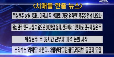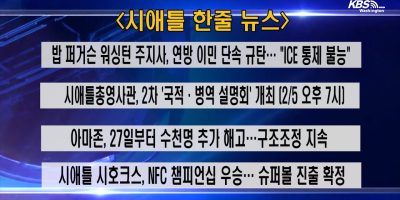 속보 No items. KBS-WATV 라이브 스트리밍 워싱턴주 / 오리건주 로컬뉴스 ‘줄리강’ 시애틀시의원 후보 후원 한인 브런치…지역현안 허심탄회 논의 February 03, 2026 시애틀 시의회 5지역구 의원에 출마한 줄리 강(Julie Kang) 후보를 위한 브런치… 미국 중소기업청, SBA 영주권자 대출 전면 차단…”미국 시민만 가능” February 03, 2026 미국 중소기업청(SBA)이 영주권자를 주요 대출 프로그램에서 완전히 배제하는… 시애틀 한국교육원 “토픽 강좌부터 유학박람회까지”…2026년 사업 전격 발표 February 03, 2026 시애틀한국교육원이 1월 31일 벨뷰 교육원 로비에서 ‘2026년 교육사업 계획발표회’를… 뱅크오브호프, 설날 맞아 한국 등 아시아 5개국 무료 송금 February 02, 2026 뱅크오브호프가 설날을 맞아 고객들을 대상으로 해외 무료 송금 행사를 실시한다.… 한인 에리카 정, 도시숲 보호 위해 킹카운티 보존구 이사회 출마했다 February 02, 2026 한국인 에리카 정이 킹 카운티 보존구(King Conservation District, KCD) 이사회 3선거구… 광역시애틀한인회, UW 한인학생회 ‘코리안 데이 & 컬처 멤버십 드라이브’ 후원 February 02, 2026 광역시애틀한인회는 2026년 1월 30일, University of Washington 인근 Cafe on the Ave에서… 시애틀 I-5 공사로 출퇴근 악몽… 린우드→시애틀 한시간 넘게 걸려 January 30, 2026 워싱턴주 역사상 최대 규모의 고속도로 보수 공사가 시애틀 지역 출퇴근 패턴을… 한국계 브라이언 서랫, 시애틀 부시장 선임 축하 리셉션 2월 11일 개최한다 January 30, 2026 한인 브라이언 서랫의 시애틀 부시장 임명을 축하하는 범한인사회 리셉션이… “아직 짝을 못 찾으셨나요?” 3월14일 한인 젊은이 매칭 이벤트 열린다 January 30, 2026 시애틀 지역 한인 청년들을 위한 만남의 장이 열린다. 비영리단체 반지(Banji)가… 우주정거장 다녀온 이소연 박사, 시애틀 한국교육원에 도서 200여권 기증과 강연 마쳐 January 30, 2026 시애틀한국교육원(원장 이용욱)은 2026년 1월28일 한국 최초 우주인인 이소연… 동영상 뉴스 KBS-WATV 시애틀지역(서북미) 한줄뉴스/서북미주간날씨/뉴스게시판(20260126) “한·몬태나, 첨단 산업부터 K 컬처까지…시애틀서 “사람이 조직의 힘” 대한부인회, 재미한국학교 서북미지역협의회,”한글학교 교장들 한자리에… 2026년 서북미연합회, 페더럴웨이 한인회 가입 승인…”15년 CBMC 시애틀 지회 새 출발…최명희 새해 첫 만남 가진 타코마 5MinBiz 5MinBiz (Episode 35) 세금보고를 위한 5MinBiz (Episode 34) OMWBE소수민족 및 5MinBiz (Episode 33) 주정부에 물품이나 5MinBiz (Episode 32) “유튜브, 틱톡 5MinBiz (Episode 31) “유튜브, 틱톡 5MinBiz (Episode 30) 행정위반 통지서 5MinBiz (Episode 29) 행정위반 통지서 Business Focus