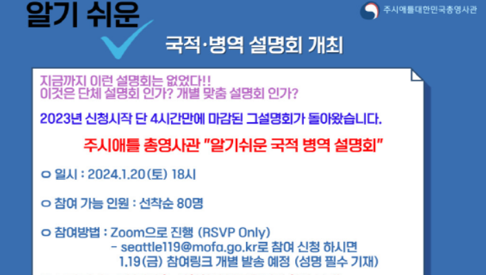 Local News 시애틀총영사관, 온라인으로 국적ㆍ병역설명회를 개최한다 kbsadmin January 17, 2024 시애틀영사관은 17일 보도자료를 통해 “오는 20일(토) 오후 6시”며 “선착순… Read More