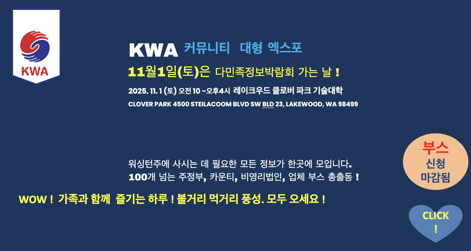 53년 역사의 대한부인회(이사장 박명래)가 오는 11월 1일 토요일에 워싱턴주 내 다민족들과 함께, 창사 이래 최대 규모인 “KWA 커뮤니티 엑스포 2025”행사를 연다. 이 행사는 워싱턴주에서 생활하는 데 필요한 모든 정보를, 주와 카운티, 시와 비영리 단체, 그리고 대한 부인회로부터 직접 상담받을 수 있는 원 스탑 정보 박람회이다.
