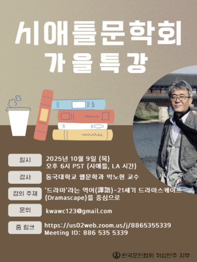 한국문인협회 워싱턴주 지부(시애틀문학회, 회장 박보라)가 가을을 맞아 동국대학교 박노현 교수를 초청해 줌 문학 특강을 개최한다.