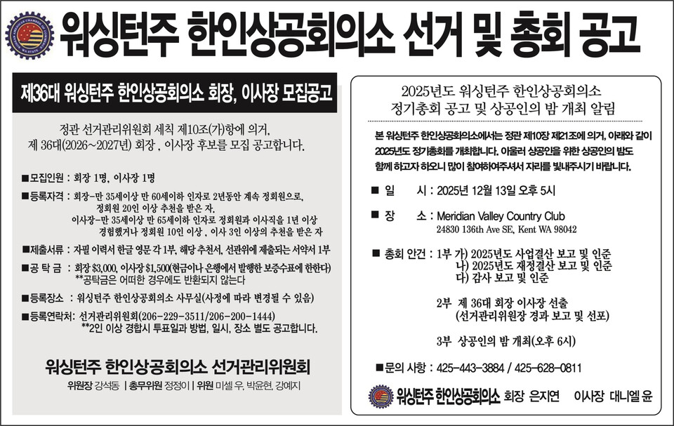제36대 회장과 이사장은 오는 12월 13일 오후 5시 켄트의 메리디언 밸리 컨트리클럽(24830 136th Ave SE, Kent, WA 98042)에서 열리는 정기총회에서 최종 선출된다.