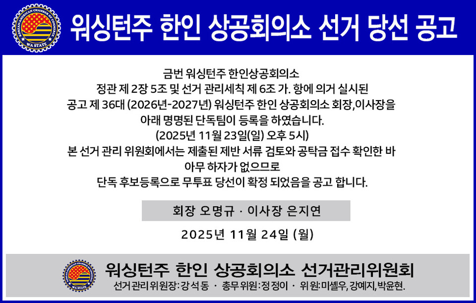 워싱턴주 한인상공회의소 선거관리위원회는 24일 11월 23일 오후 진행된 선거 등록 결과를 발표했다.
