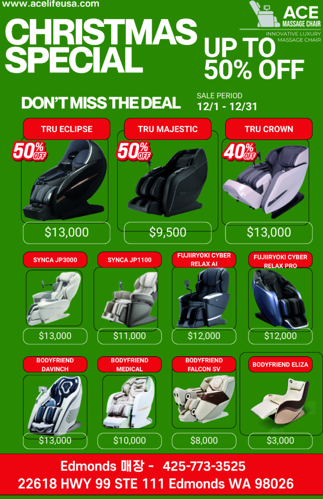 미국 워싱턴주 프리미움 안마의자 시장을 이끌어온 “ACE MASSAGE CHAIR”가 2025년 연말을 맞이 하여최대 규모의 특별 이벤트을 시작 했다. 듀얼 롤러을 장착한 프리미엄 안마의자 TRU CRWON 모델을 포함한 주요 제품을 최대50%까지 할인 합니다.
