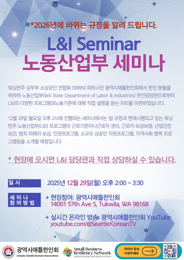 광역시애틀한인회는 워싱턴주 상무부 소상공인 연합회(SBRN) 파트너인 광역시애틀한인회에서 한인 분들을 위해 노동산업부(L&I) 한인담당관으로부터 L&I의 다양한 프로그램과 노동기준에 대해 직접 설명을 듣는 자리를 마련했다고 밝혔다.