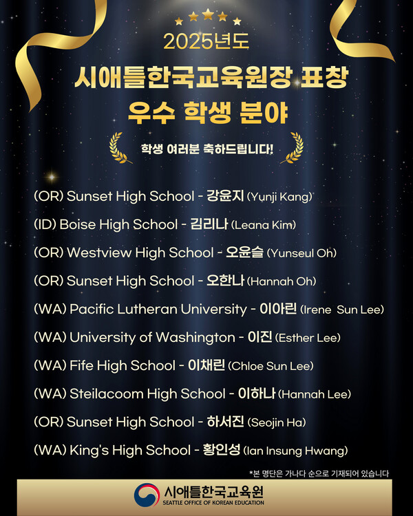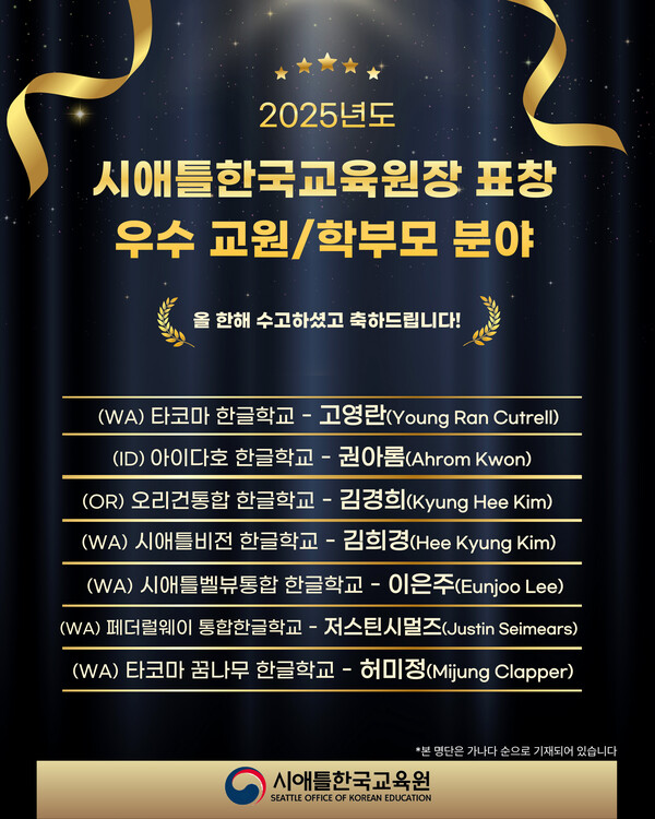 시애틀한국교육원(원장 이용욱)이 2025년 한 해를 마무리하며 우수 동포 학생 및 교원 등 표창 수여 대상자를 발표했다.