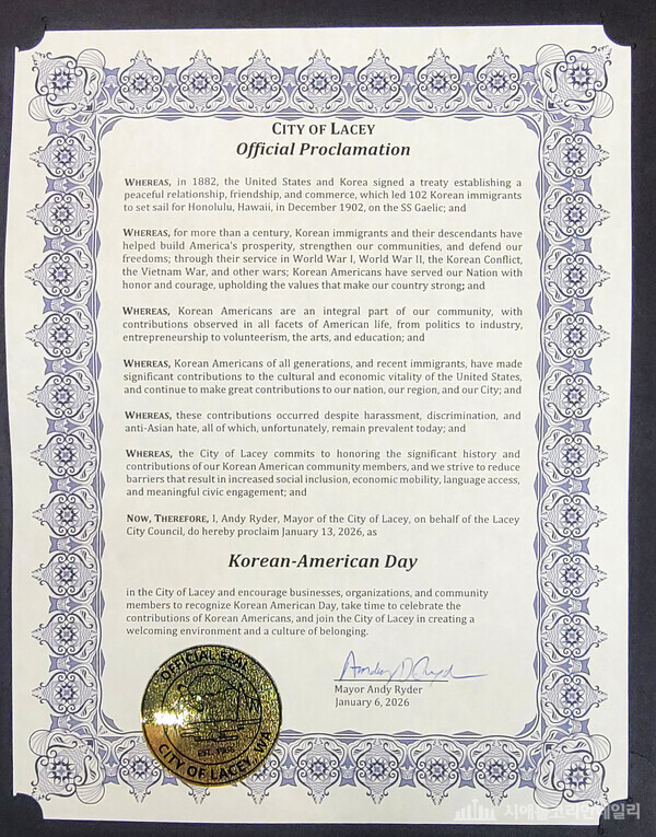 워싱턴주 레이시 시가 미주 한인들의 역사적 공헌을 기리기 위해 1월 13일을 공식 기념일로 선포했다. 앤디 라이더(Andy Ryder) 레이시 시장은 시 의회를 대표해 한인 커뮤니티의 헌신에 감사를 표하는 공식 선포문을 발표했다.