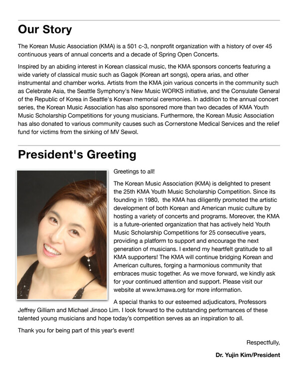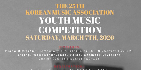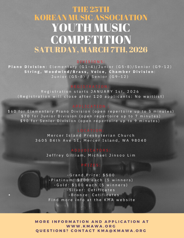 워싱턴주 한인음악협회(Korean Music Association·KMA)가 제25회 청소년 음악 장학 콩쿠르를 오는 3월 7일(토) 머서 아일랜드 장로교회(3605 84th Ave SE, Mercer Island, WA 98040)에서 개최한다.
