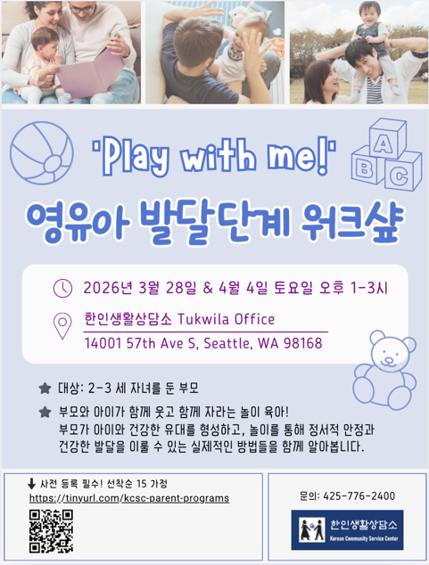 The Korean Community Service Center (Director: Jumi Kim) will host a bilingual ‘Play with Me’ Parent Workshop for families with 2–3-year-old children on Saturday, March 28 and Saturday, April 4. The program is funded by King County’s Best Starts for KIDS grant.