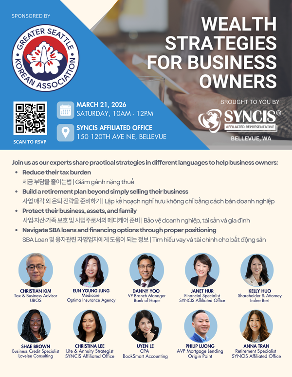 그레이터시애틀한인회(Greater Seattle Korean Association)가 오는 21일(토) 워싱턴주 벨뷰에서 한인 소상공인을 위한 재정 전략 세미나 ‘웰스 스트래티지스 포 비즈니스 오너스(Wealth Strategies for Business Owners)’를 개최한다. 세미나는 SYNCIS 사무소(150 120th Ave NE, Bellevue) 주관으로 오전 10시부터 낮 12시까지 진행된다.