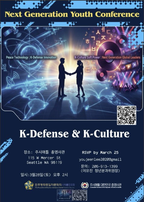 민주평화통일자문회의 시애틀협의회와 주시애틀대한민국총영사관이 공동으로 한인 차세대를 위한 ‘Next Generation Youth Conference(차세대 청년 컨퍼런스)’를 3월 28일 주시애틀총영사관에서 개최한다. 행사는 이날 오후 2시 시작되며, K-방산과 K-문화, 그리고 한반도 평화통일을 주제로 청년들에게 미래 비전을 제시하는 자리로 마련된다.