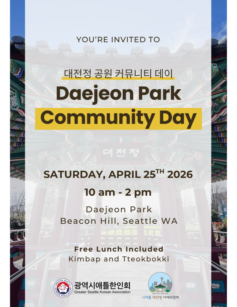 광역시애틀한인회 (회장 김원준 대전정 위원회 위원장 코리 한)는 오는 4 월 25 일 토요일 오전 10 시부터 오후 2 시까지 열리는 ‘대전정 공원 커뮤니티 데이’는 주민 교류를 넘어, 최근 제기된 공원 주변 피해 문제를 공유하고 해결 방안을 모색하는 데 초점을 맞추고 있다.