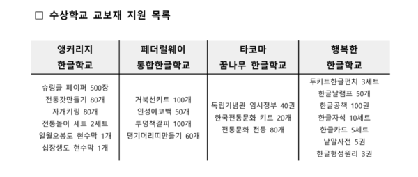 선정된 4개 학교에는 재외동포청과 전북특별자치도교육청이 지원한 학습 교구와 물품이 제공된다. 다양한 한글교육 교구 및 전통문화 체험 키트부터 미주 한인사 웹툰 자료까지 학교별로 평균 100만 원 상당의 교보재가 지원될 예정이다. 수상 교안은 향후 서북미 지역 한글학교 전체에 공유돼 교육과정의 질적 향상과 계기교육 정착에 활용된다.