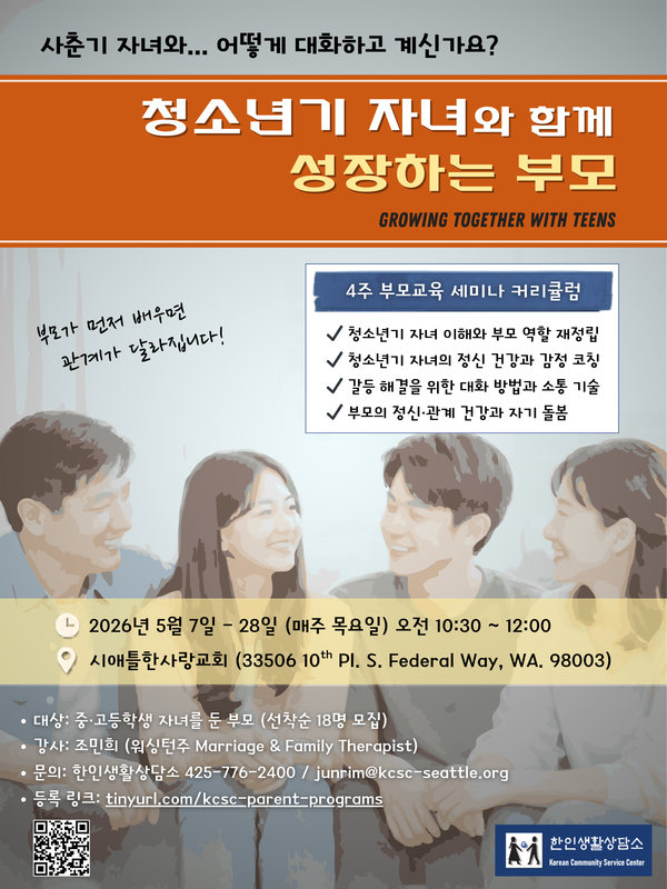이번 세미나는 중·고등학생 자녀를 둔 부모라면 누구나 참여할 수 있으며 선착순 18명을 모집한다. 참가 신청은 등록 링크(https://tinyurl.com/kcsc-parent-programs)를 통해 가능하며, 추가 문의는 한인생활상담소(425-776-2400, www.kcsc-seattle.org) 또는 박준림 부모교육 스페셜리스트(junrim@kcsc-seattle.org)에게 하면 된다.