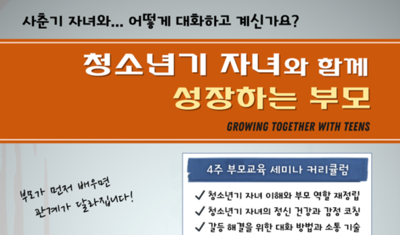 한인생활상담소(소장 김주미)가 청소년 자녀를 둔 이민 가정 부모들을 위한 ‘4주 부모교육 세미나’를 개최한다. ‘청소년기 자녀와 함께 성장하는 부모(Growing Together with Teens)’를 주제로 열리는 이번 세미나는 오는 5월 7일부터 28일까지 매주 목요일 오전 10시 30분부터 낮 12시까지, 페더럴웨이 소재 시애틀 한사랑 교회(33506 10th Pl. S. Federal Way, WA 98003)에서 진행된다.