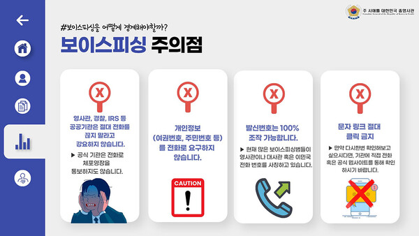 시애틀총영사관은 최근 총영사관 발신 번호를 도용한 보이스피싱 피해 사례가 다시 급증하고 있다며 지역 한인들에게 각별한…